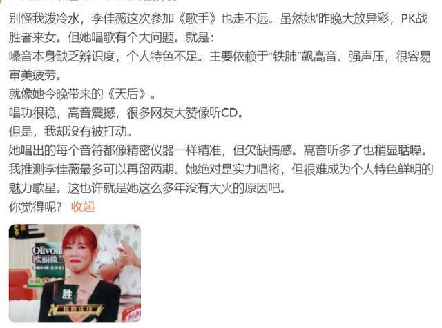 咱们皆知谈,《歌手2025》的舞台不缺唱歌好的歌手,而是缺辨识度高的歌手,本季参与录制的歌手,林志炫、米奇、格瑞丝,更偏向于高音,比拟于李佳薇,他们每个东谈主皆有属于我方的特点,而李佳薇会显得个东谈主特点不及,她的唱功莫得任何问题,但只依赖于“铁肺”飙高音,很容易形成不雅众审好意思疲钝。