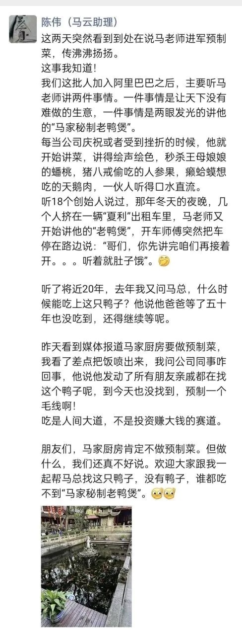 11月25日音书,陈伟在一又友圈发文提到:“马家厨房笃定不作念预制菜。”他在这条一又友圈里敷陈了马云的“马家秘制老鸭煲”的故事。