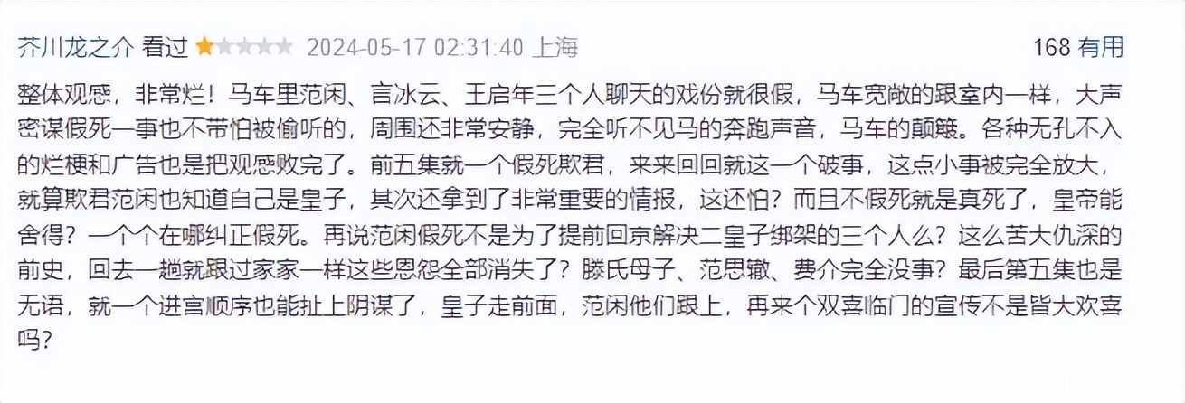马车里范闲、言冰云、王启年三个东谈主聊天的戏份就很假,马车广阔的跟室内同样,高声密谋假死一事也不带怕被偷听的,周围还特殊欢腾,完全听不见马的奔走声息,马车的颤动。
