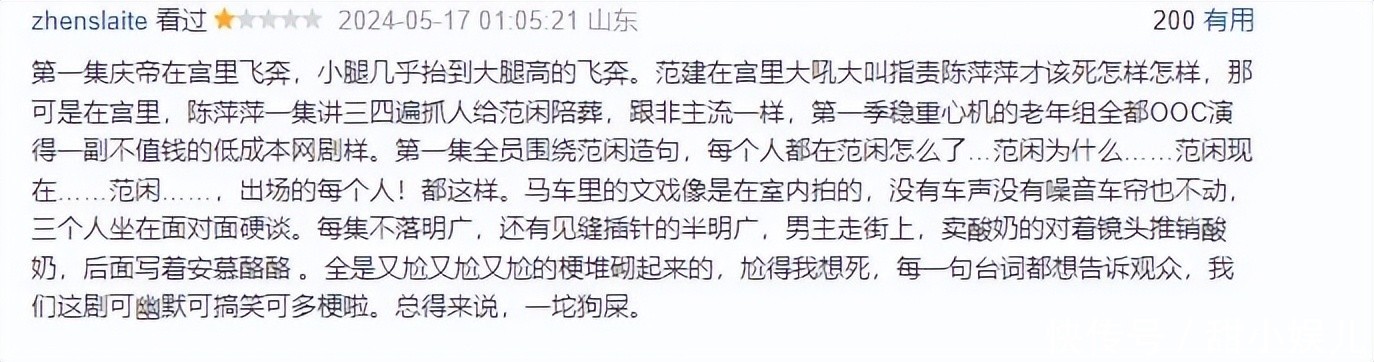 第一集庆帝在宫里奔驰,小腿确凿抬到大腿高的奔驰。范建在宫里大吼呐喊磋议陈萍萍才活该若何若何,那但是在宫里,陈萍萍一集讲三四遍握东谈主给范闲陪葬,跟非主流同样,第一季稳要点机的老年组十足OOC,演得一副不值钱的低资本网剧样。