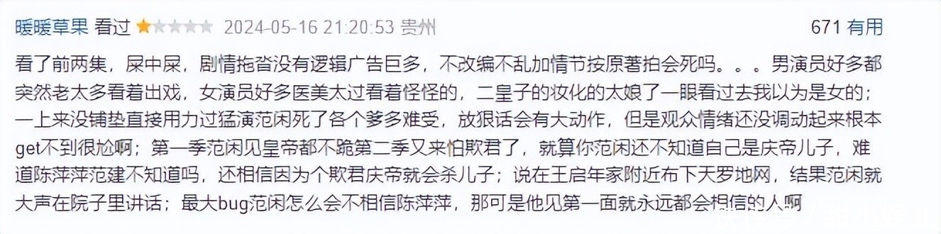 但大致是因为不雅众的期待太高,热度太大,只是开播第一天,《庆余年2》的口碑已崩盘,清一色差评。