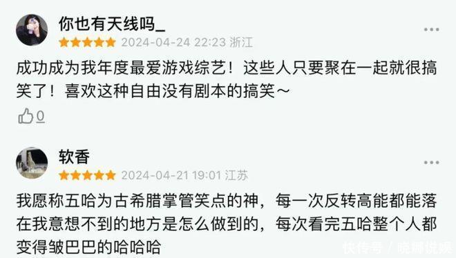 “可笑”“下饭”“精神状况”是豆瓣热评里的高频词,他们反应了当下年青东谈主最渴慕实时高傲的心情需求。《哈哈哈哈哈》从节目名初始就把“让不雅众鼎力大笑”当管事迹成见,且该系列已然是打工东谈主下饭首选的电子榨菜之一,而哪个社恐星东谈主不向往邓超为代表的五哈成员精深放飞自我的灿艳精神状况呢?