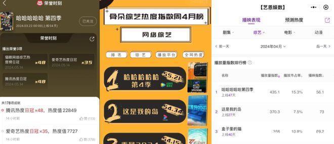 据猫眼专科版网站统计,当今《哈哈哈哈哈4》开播53天(自3月23日上线)已接连拿到了48个猫眼网综热榜日冠、48个腾讯热过活冠、35个爱奇艺热过活冠。
