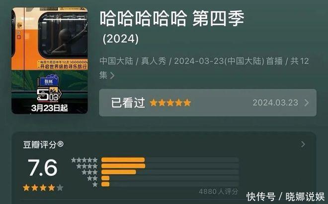 当先是豆瓣,《哈哈哈哈哈4》本季开出了豆瓣7.6的高分,热评区最常见的是26.7%的五星好评和34.2%的四星筹商,这对于一档综N代而言相配穷苦。