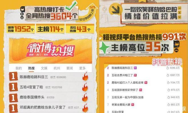 话题度方面,《哈哈哈哈哈4》每期必出爆梗,中期战报显现,节目当今已斩获 #陈赫鹿晗跳科目三# 等全网热搜3604个(较往季同期高涨52%),其中微博热搜1952个、短视频平台热搜热榜991次,可以说该节目已提前预订了“2024年度最多名时局综艺”。