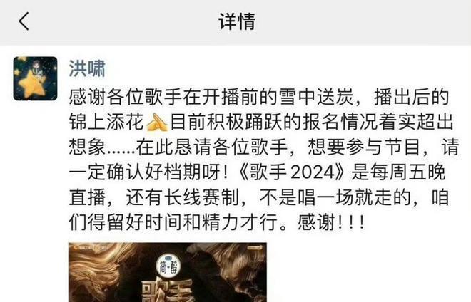 天然繁多歌手纷繁请战加入歌手阵营,然而《歌手2024》有严格的报名端正,是以导演洪啸也实时发文修起了歌手们加入的问题,直言极度感谢众人开播前的枯木逢春,播出后的精雕细镂。